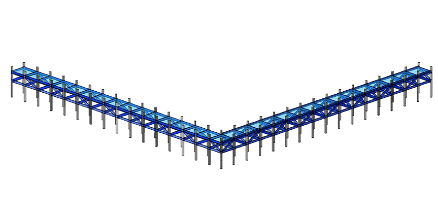 Il pontile in legno è stato studiato come un sistema di travi in legno disposte secondo uno schema spaziale. Il molo, è costituito da un braccio centrale ortogonale alla costa di lunghezza pari a 90 metri, e da 3 bracci di lunghezza pari a 30 metri cadauno ortogonali a quest’ultimo. Per evitare la enorme quantità di aste da verificare, è stato studiato soltanto un modulo composto da 1 braccio e da un terzo dell’asse centrale.
